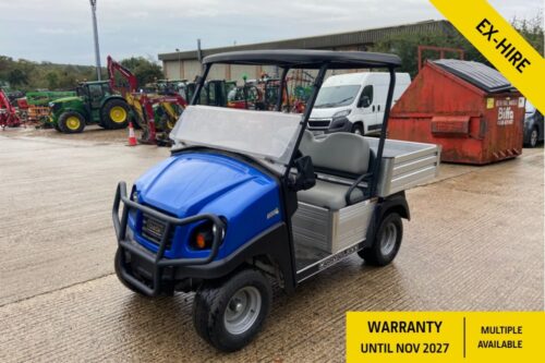 BRIGHT BLUE BODY WITH BLACK CANOPY AND GREY SEATS. 48V SYSTEM (6X8V) WITH ERIC CHARGER, 15MPH TOP SPEED. FEATURES INCLUDE CARGO BOX, TAILGATE TETHER, HINGED WINDSHIELD, FULL LIGHTING KIT, FRONT BRUSH GUARD, DIFFERENTIAL GUARD, FENDER KIT, SIDE MIRRORS, 12V POWER POINT, AND PREMIUM 6-PLY TIRES.